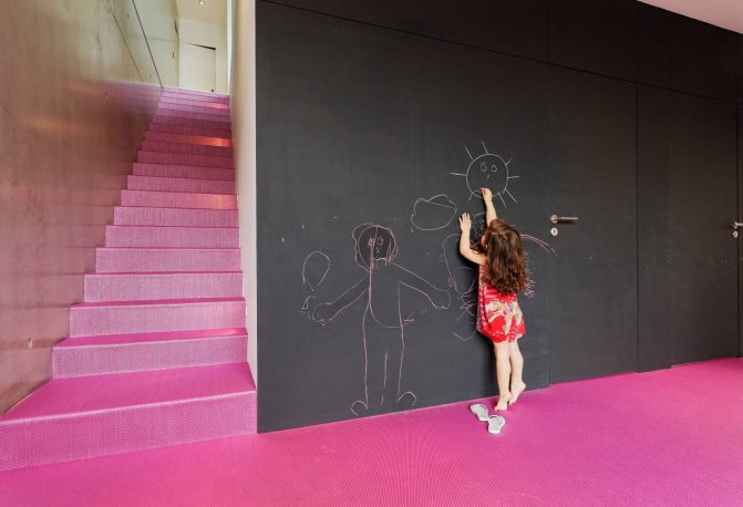 Dans certaines pièces (par exemple, dans les chambres d'enfants), l'utilisation de peinture à l'ardoise noire est appropriée: d'une part, le noir masque les interstices, et d'autre part, l'enfant pourra peindre les murs sans dommage pour réparation.
