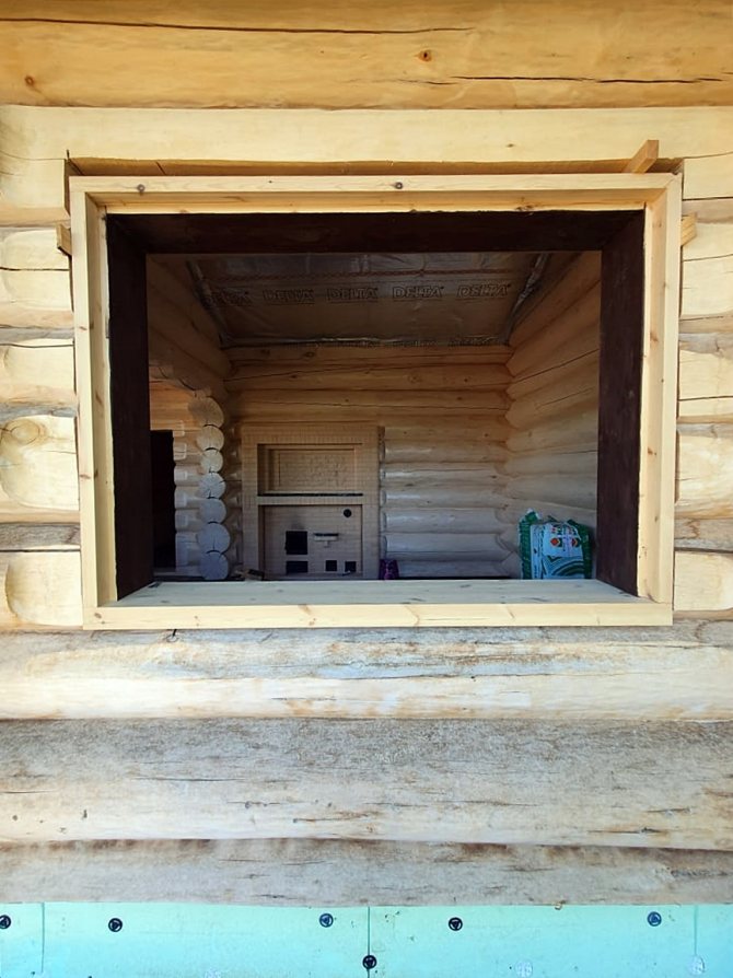 Ouverture de la fenêtre dans une maison en rondins sous une fenêtre en plastique - vue extérieure