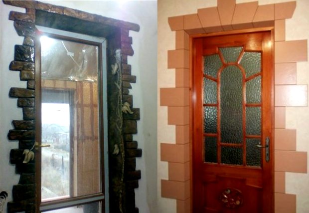 Cette option a peu de popularité en raison de usage limité. Avec leur aide, des portes sont réalisées dans des pièces dont les murs sont entièrement ou partiellement revêtus de pierre artificielle. Les plateaux en céramique sont des éléments constitués de carreaux de céramique, qui sont fixés à un adhésif spécial. Cette option conviendra également pour décorer les portes de la salle de bain de l'intérieur. Vous vous débrouillerez certainement vous-même avec la fabrication de tels plateaux. Il suffit de couper soigneusement le carreau en fragments de la taille requise et de poncer les bords avec du papier de verre. Si vous faites preuve d'un peu d'imagination, vous pouvez créer une composition intéressante de plusieurs types de carreaux présents à l'intérieur de la pièce. De plus, une pierre artificielle peut être utilisée comme matériau pour ces plateaux. Une porte encadrée d'une manière aussi intéressante complétera harmonieusement le décor.
