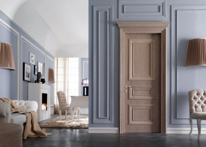 Important! Sans encadrement, la porte se perd dans le fond du mur. Les plateaux attirent l'attention sur lui avec une finition contrastée, ou, au contraire, l'intègrent dans un style unique.