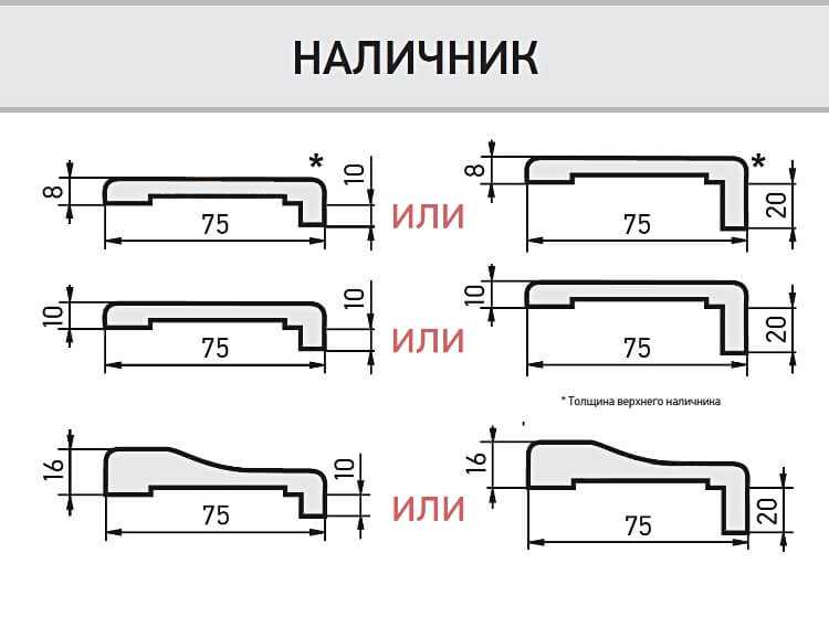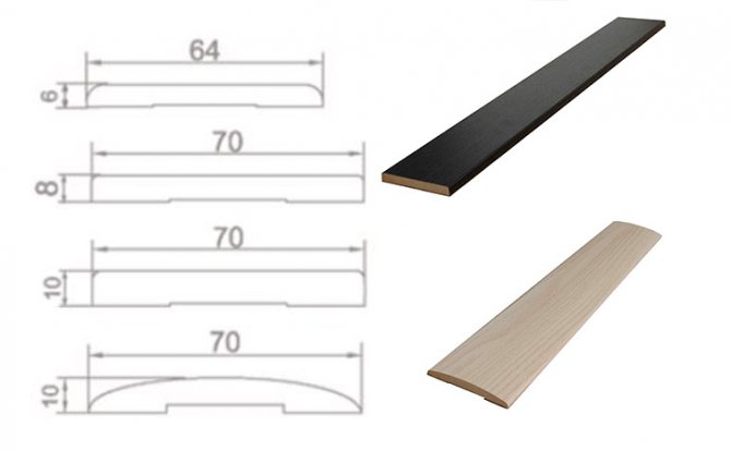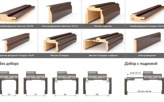 Dans la plupart des cas, les garnitures de porte sont livrées avec des feuilles de porte. Ce type de produit a une largeur standard d'un encadrement de porte intérieure - 7 cm, épaisseur - 1,2 cm, hauteur - de 190 à 235 cm.