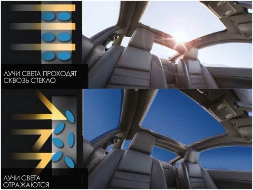Étant dans un état inactif, ces particules se déplacent de manière chaotique, sur tout le plan, formant une boule réfléchissante dense. Sous l'influence du courant, les éléments en forme de tige commencent à s'aligner progressivement, formant une grille à travers laquelle la lumière pénètre à l'intérieur de la voiture. À l'œil nu, cet effet ressemble à un assombrissement normal du verre.