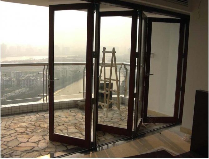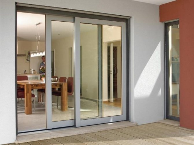 Glissement... La conception la plus simple des portes coulissantes: le vantail de la porte se déplace sur des rouleaux le long de guides métalliques. L'inconvénient de ce type de porte est l'ajustement lâche du vantail au cadre, de sorte qu'ils ne sont installés que sur des balcons chauffés.