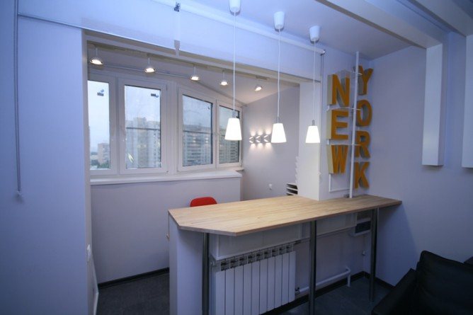 Si l'aménagement d'un nouveau grand appartement implique un bureau d'affaires ou tout autre endroit où vous lirez et travaillerez, vous devez vous occuper de l'éclairage. Pour ce faire, vous pouvez fournir de l'électricité à la loggia ou installer des lampes et les connecter via une rallonge.