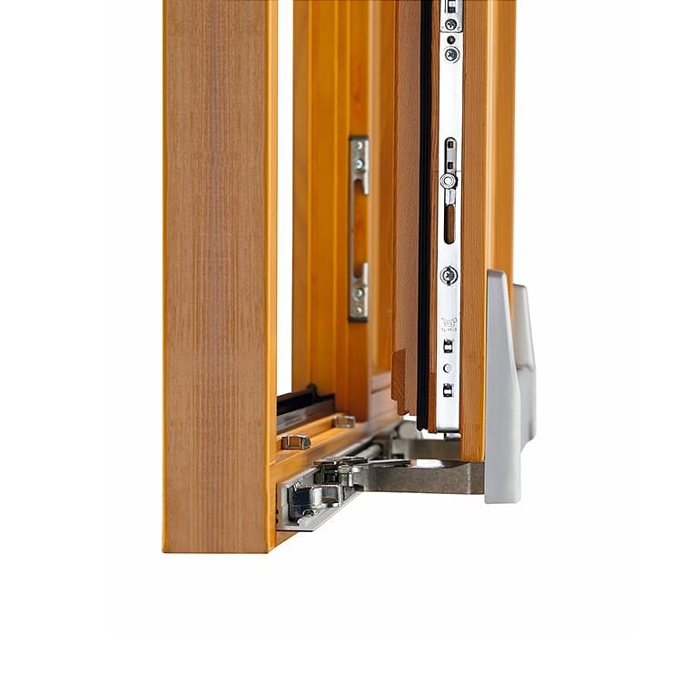Le groupe de charnières TITAN AF avec fixation renforcée maintient fermement le châssis, et les éléments en polymère résistant à l'usure dans les charnières permettent une rotation facile et douce du châssis, quel que soit le nombre de répétitions de cette action. La charnière supérieure est conçue de telle manière que même en cas de vent fort, la fenêtre se ferme en douceur. La charnière pivote doucement sur un axe triangulaire et décélère sur chacun de ses bords.