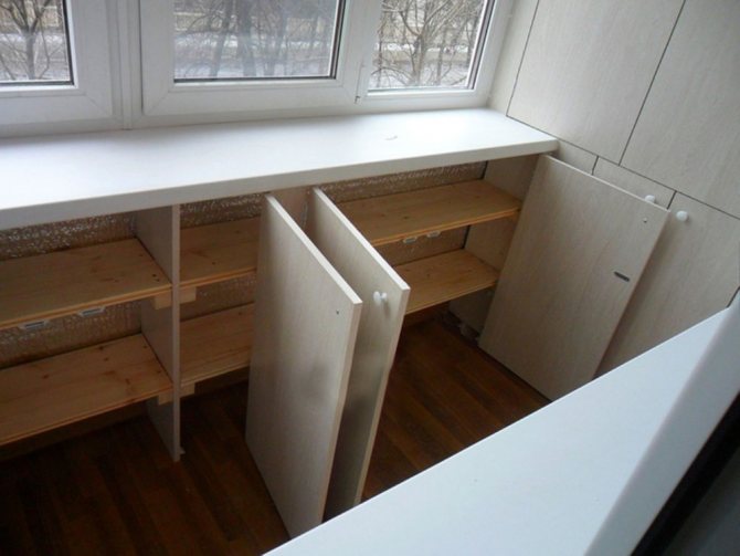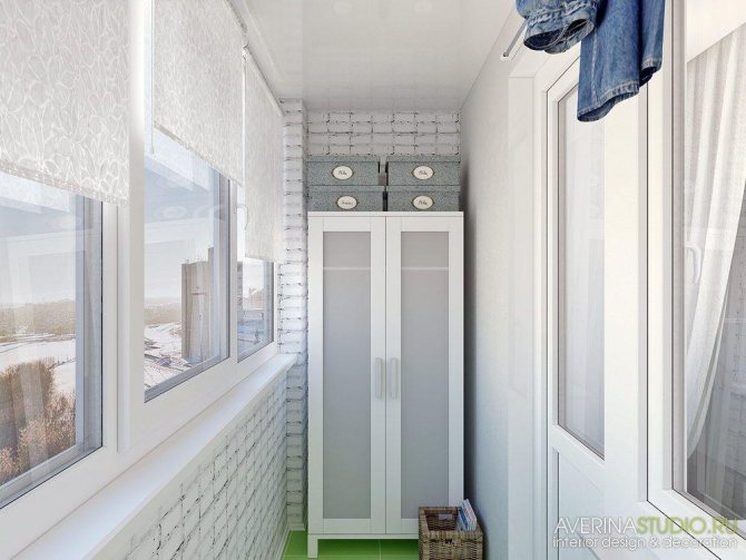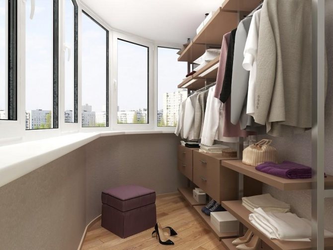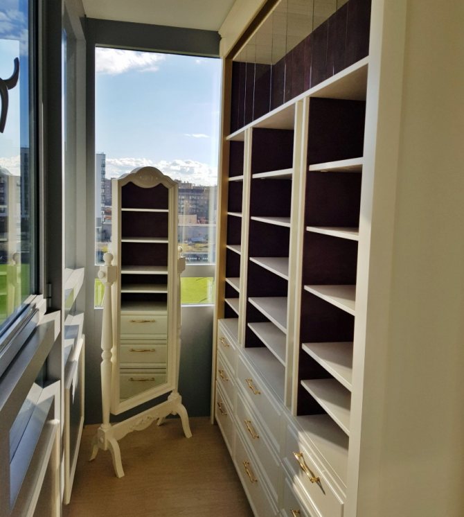 Si l'espace est petit, des éléments séparés du dressing sont placés sur le balcon. Par exemple, sous la fenêtre, vous pouvez organiser des armoires pour ranger les chaussures.