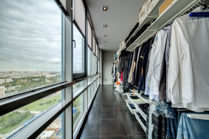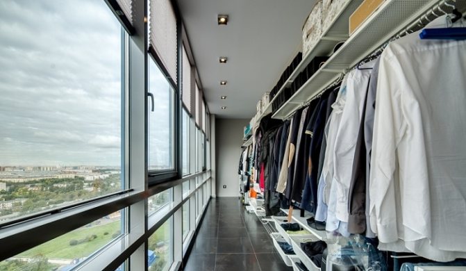 Il est très pratique d'organiser un dressing dans les loggias, car l'espace ouvert n'est situé que d'un seul côté.