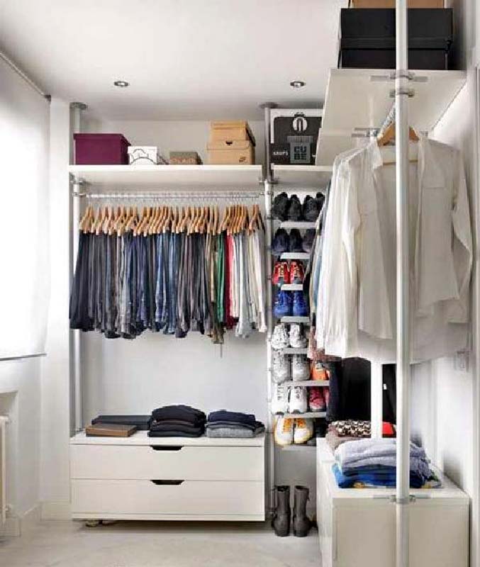 - Le dressing peut être complété par des étagères souples suspendues à un cintre. C'est logique, il n'y a pas assez d'espace sur les étagères. Le matériau textile est durable, beau et facile à entretenir.