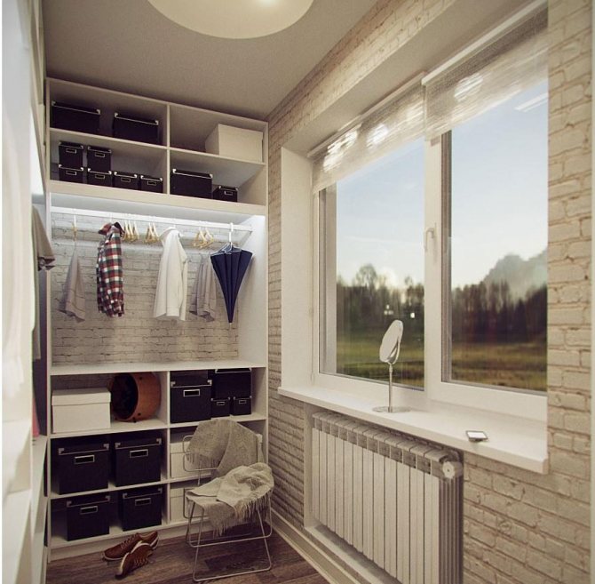 La surface d'un tel vestiaire peut être petite et sera petite, mais il y a beaucoup de lumière ici, donc des boîtes et d'autres choses seront toujours en vue. Cependant, les grandes fenêtres de loggia doivent être équipées d'une protection contre la lumière directe pour éviter de brûler les vêtements.