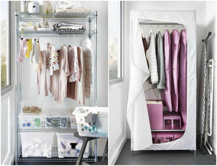 - Protection contre le soleil et la poussière requise. Des rayons UV excessifs endommagent le tissu. Les étagères ouvertes ne conviendront qu'aux balcons sans fenêtre. Si le balcon fait face à la chaussée, les vêtements deviendront rapidement poussiéreux et absorberont les gaz d'échappement. Garder les fenêtres constamment fermées ne fonctionnera pas, car une ventilation est nécessaire.
