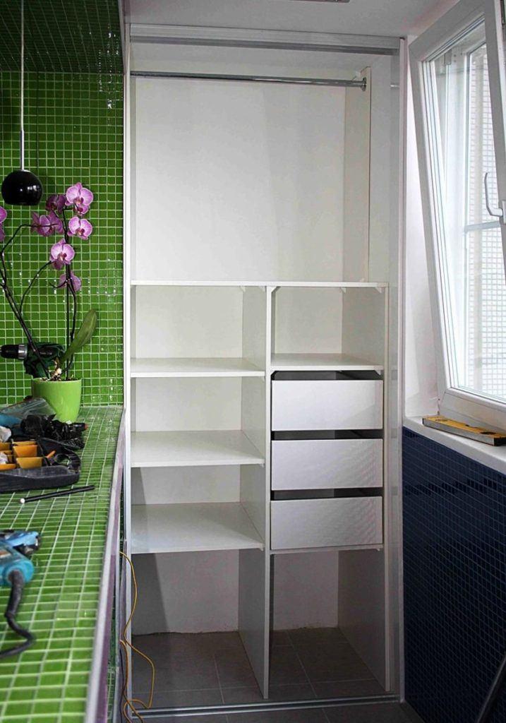 Pour un petit balcon vitré, vous pouvez utiliser des armoires à hauteur étroite et des étagères à charnières avec des tiroirs séparés placés dessus.