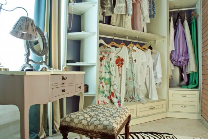 Une pièce séparée pour ranger les choses dans l'appartement. Vous pouvez créer un dressing séparé soit dans l'ancien débarras, soit sur la loggia isolée. S'il n'y a pas de garde-manger, vous pouvez séparer une petite partie du couloir.