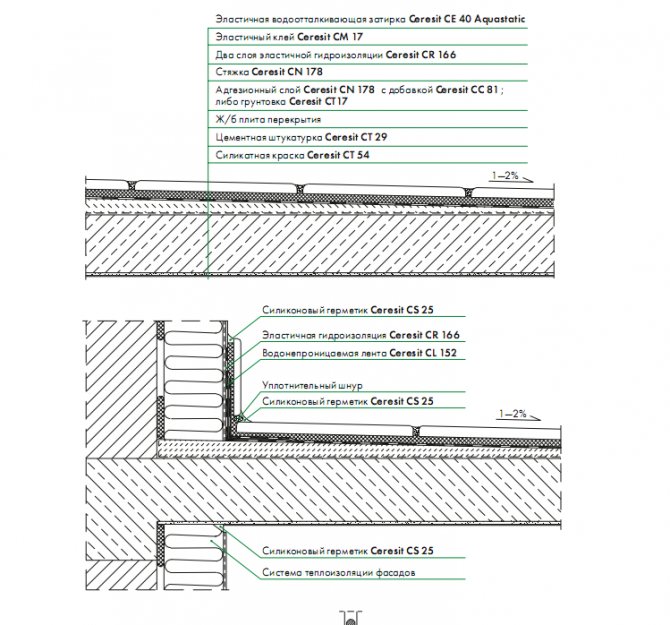 Habituellement, la dalle supérieure du balcon est isolée avec des composés pénétrants. Dans ce cas, la séquence suivante est sélectionnée pour organiser l'étanchéité: