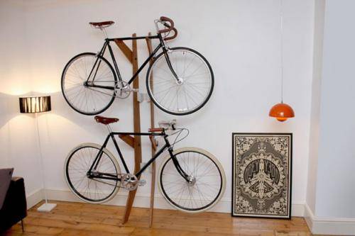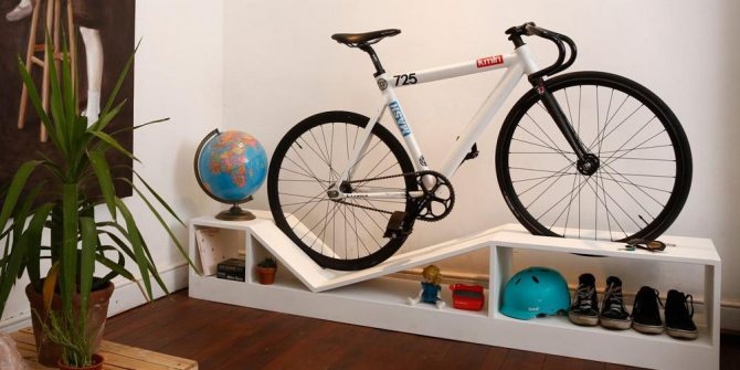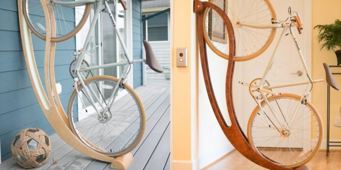 Dans un magasin spécialisé, vous pouvez choisir une option d'étagère différente. Il maintient non seulement le vélo en toute sécurité, libère de l'espace sur le sol, mais décore également l'intérieur.