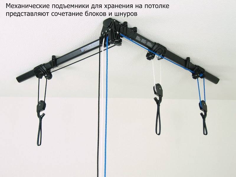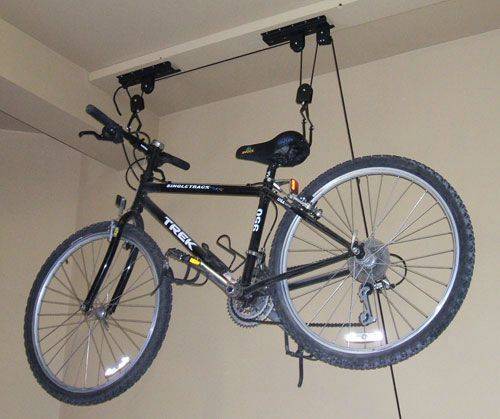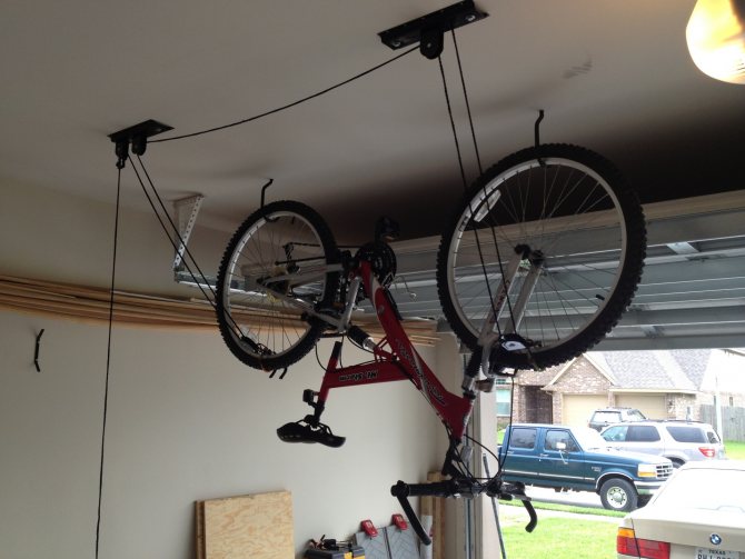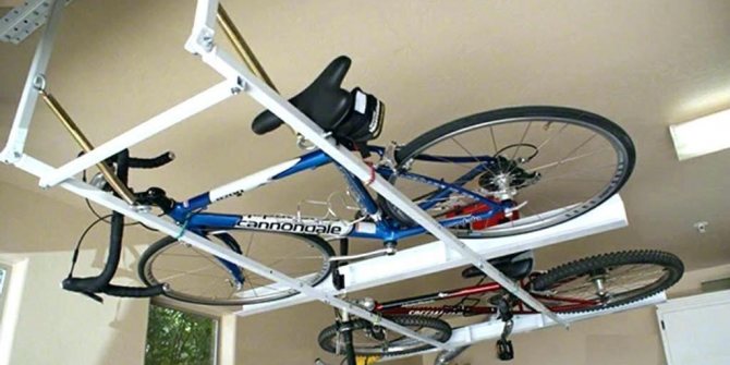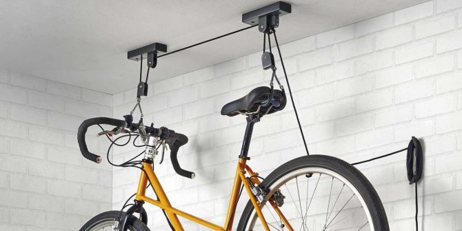 3) Sous le plafond. Ce type de fixation implique un stockage à long terme du vélo - par exemple, en hiver. S'accorde parfaitement avec un pied de sol. Il existe deux types - avec un système de poulie qui vous permet de soulever et d'abaisser le vélo sans utiliser d'échelle, et un support simple avec des crochets sous le plafond. Non recommandé pour les modèles pesant plus de 22 kg.
