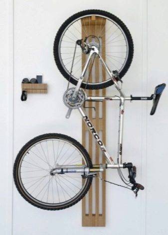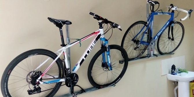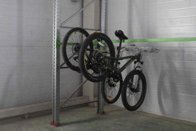 Diffère par la grâce de la fixation du vélo avec des crochets en position verticale. Dans ce cas, la roue avant est fixée au crochet supérieur et la roue arrière repose sur le roulement inférieur.