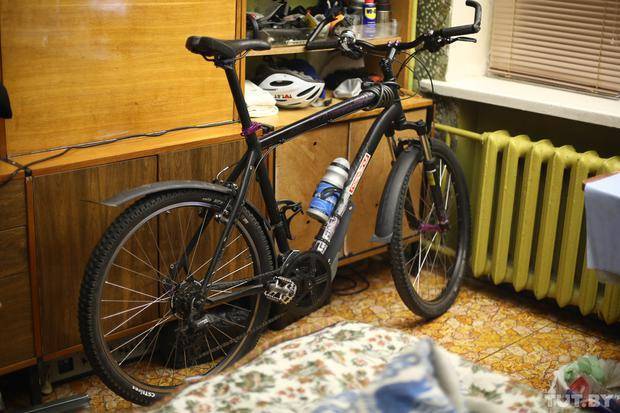 - Pas l'endroit le plus pratique n'a été choisi pour mon ami de fer. Ceci est un salon. Il y a très peu de place dedans, et il n'y a pratiquement aucun endroit où mettre le vélo, donc il est rangé près de la fenêtre, à un pas de mon lit, à un mètre de ma table. Pour plaisanter, vous pouvez dire que je couche pratiquement avec lui. Mais ces conditions sont dictées par le mode de vie: je vis dans une petite chambre louée. Les propriétaires de l'appartement ne me dérangent pas si je mets mon vélo dans le couloir ou sur le balcon, mais il y a encore moins de place, et la longue base de vélo (sous ma hauteur de 188 cm) bloque tout le passage. En fait, il y a très peu de saleté : le linoléum me sauve, avec lequel j'ai recouvert tout le sol. Bien sûr, vous devez passer l'aspirateur et le laver à nouveau, mais cela prend très peu de temps. Après la pluie, il ne reste plus qu'à essuyer la saleté de la zone de stockage. Et en hiver, je laisse mon vélo quelques heures à l'entrée. Pendant ce temps, l'eau, le sel et les réactifs routiers en s'écoulent. Ensuite, je le soulève calmement pour le sécher sur mon sol et le roule dans la pièce.