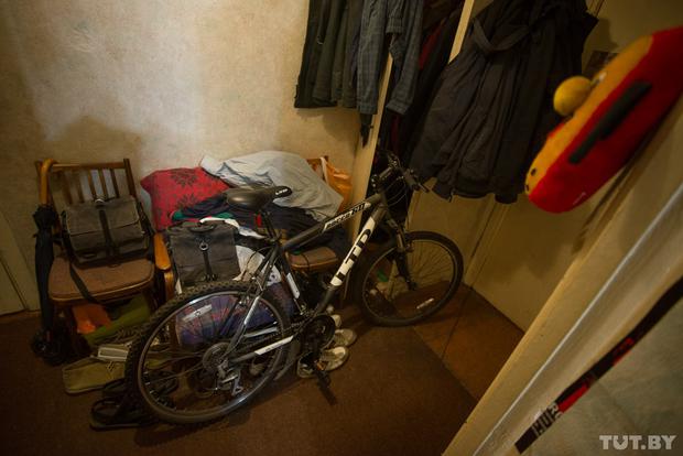 Evgeniy garde son vélo dans le couloir: