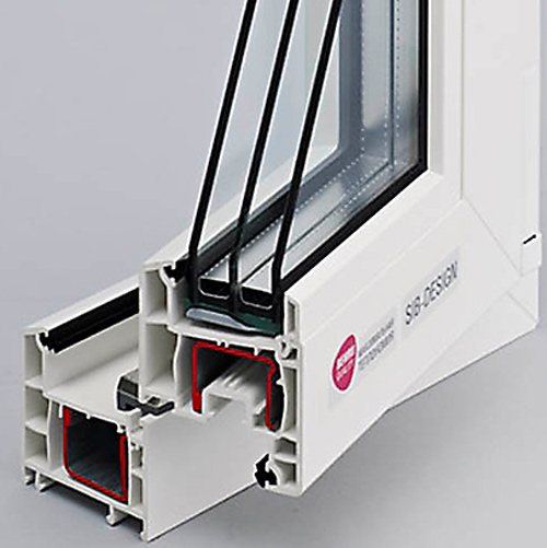 - Alu Inside à sept chambres avec trois niveaux d'étanchéité et technologie d'assemblage brevetée PVC-aluminium.
