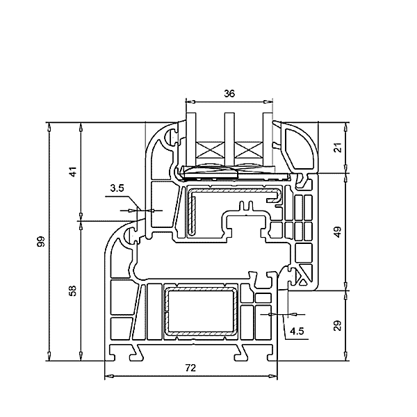 - six caméras ; - épaisseur du système 80 mm; - isolation thermique 0,98 m2 * C / W; - résistance au vent classe A ; - perméabilité à l'air et résistance à l'humidité classe A ; - joint double circuit et joint central - étanchéité totale ; - surfaces lisses, entretien facile.