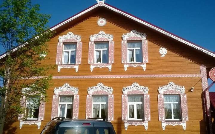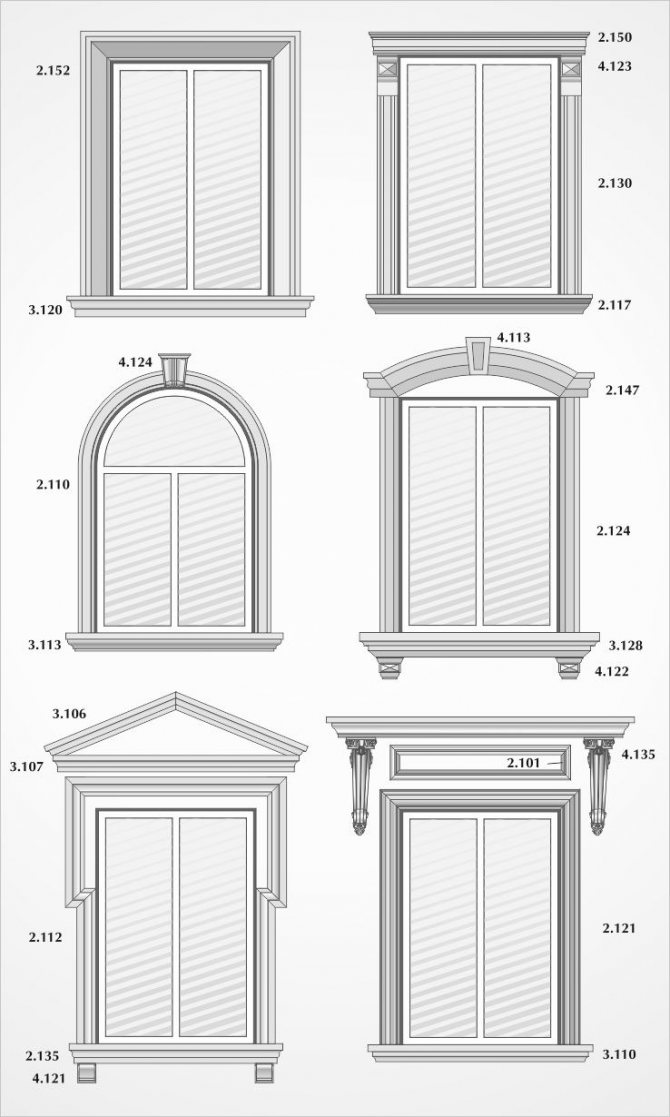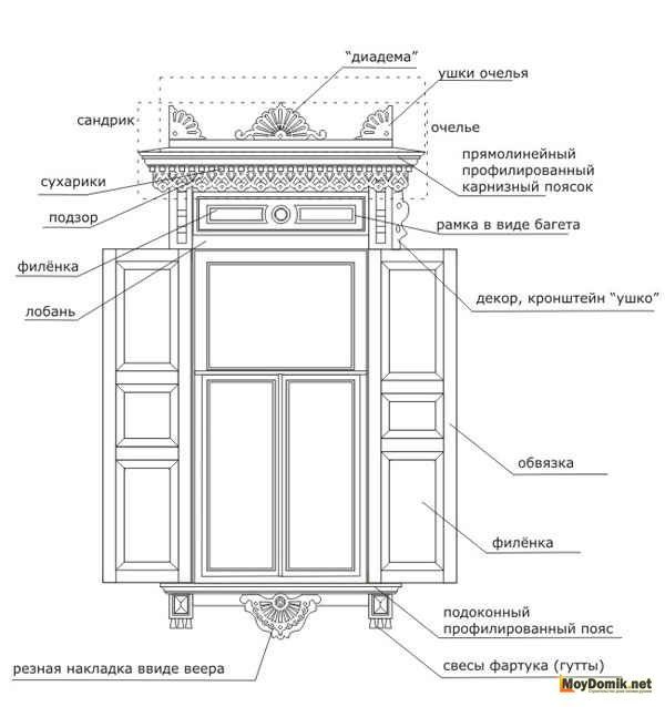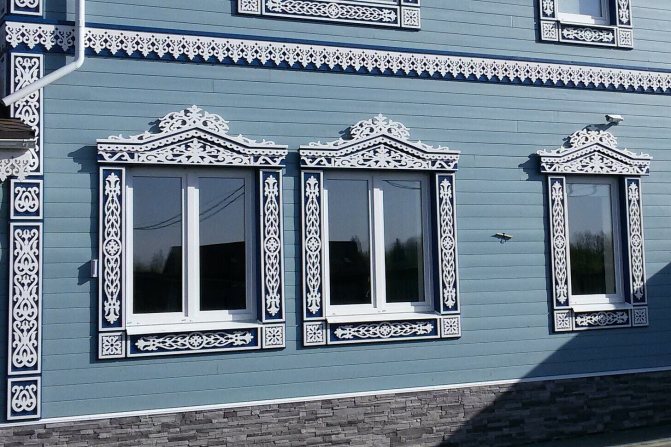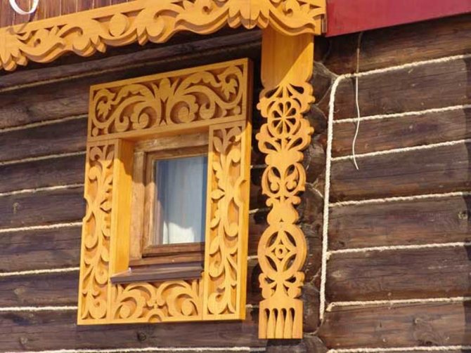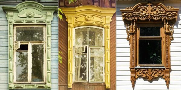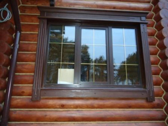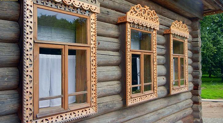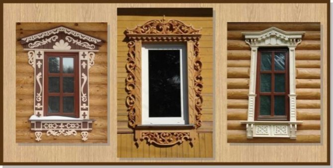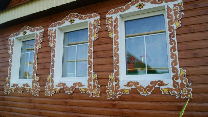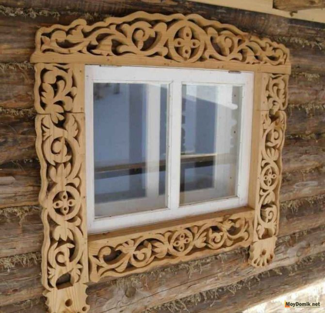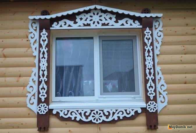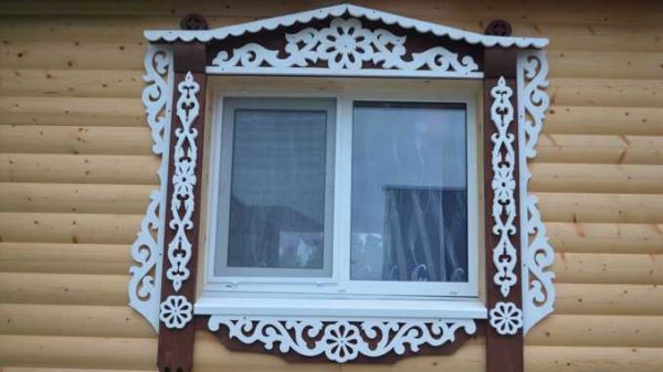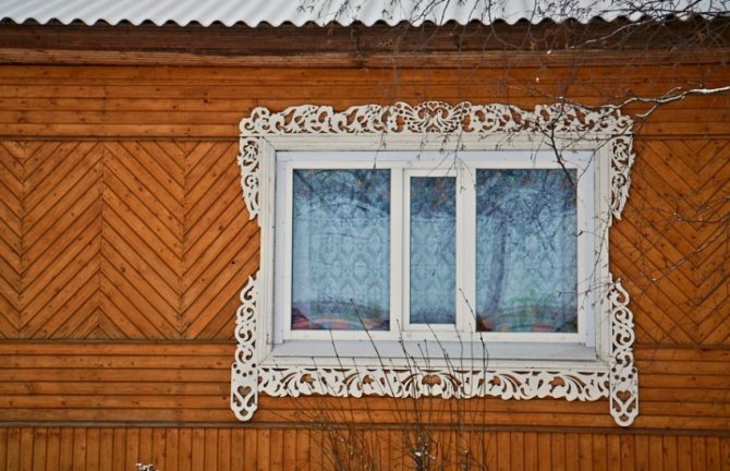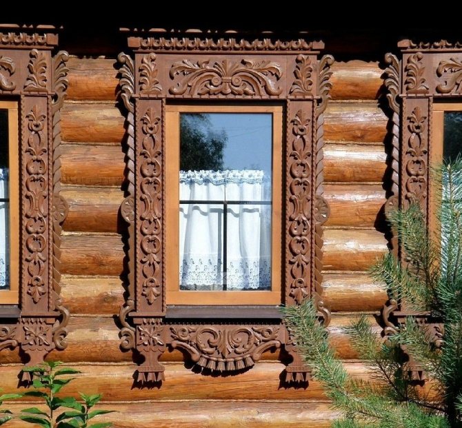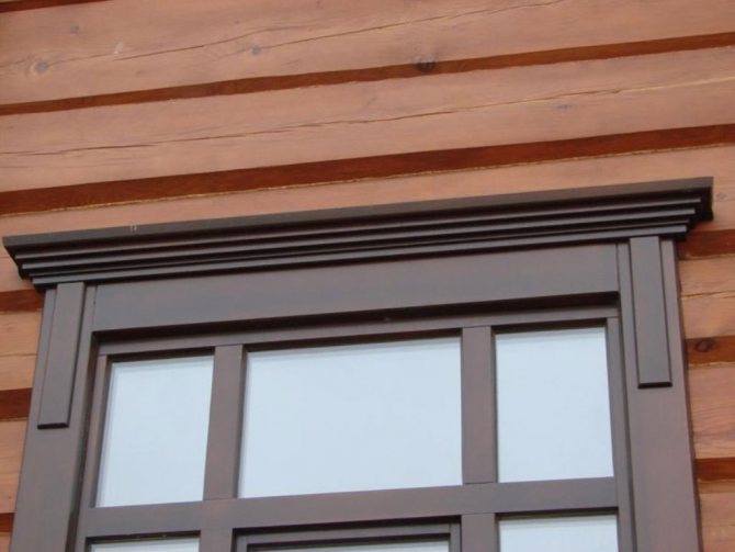 Dans les conceptions classiques de plateaux pour maisons en bois et en rondins, cette exigence a été mise en œuvre sous la forme d'une corniche massive, qui crée une sorte de couverture pour toute la partie inférieure de la fenêtre.