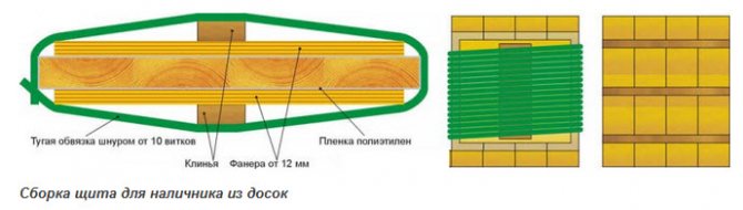 L'illustration montre que le bouclier est assemblé à partir de planches collées bout à bout. Les planches sont posées conformément à la conception interne du bois. Composition adhésive - PVA ou colle de menuiserie étanche (temps de maintien - 2-3 fois de polymérisation de la colle).