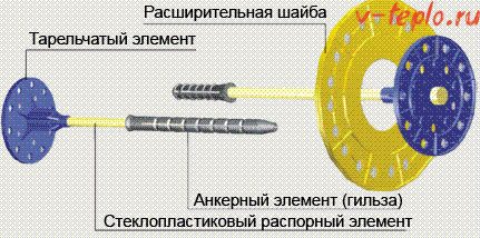 Lors de l'installation de tout matériau d'isolation thermique, des chevilles spéciales sont utilisées - elles sont appelées champignons pour un isolant thermique ou des parapluies. De tels produits sont capables de fixer de manière fiable même le matériau fragile ou de faible densité.