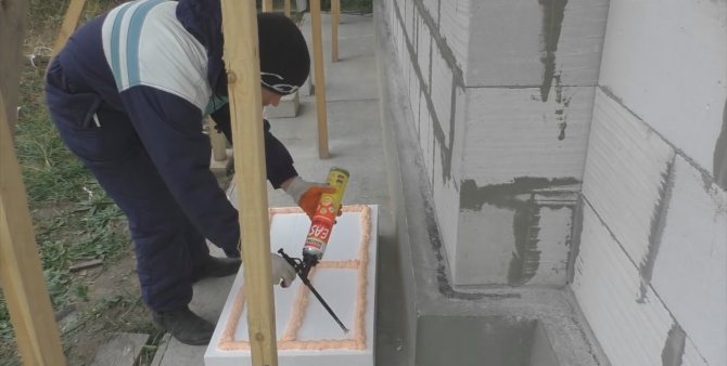 - Après avoir coupé l'ouverture pour la pose des communications, les trous sont scellés avec de la mousse de montage pour exclure la perte de chaleur