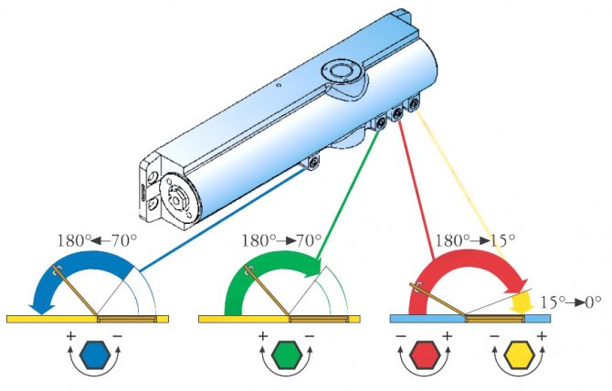 Le réglage est effectué par essai jusqu'à ce que la vitesse soit optimale. Une vitesse de fermeture élevée est bonne pour limiter l'entrée d'étrangers, d'insectes et d'air froid. Mais pour les portes intérieures ou les portes d'armoires de cuisine, un mouvement lent est généralement défini. Cette technique d'ajustement s'applique à tous les types de ferme-porte. L'essence du processus est que plus il y a de vis vissées, plus l'huile s'écoule lentement d'une cavité à une autre, plus le système fonctionne lentement.