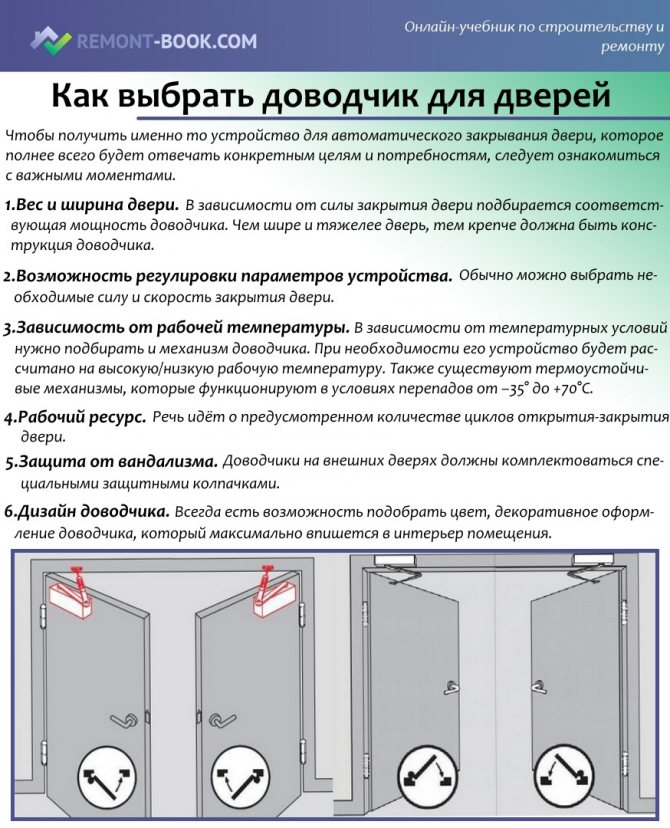 Les paramètres de l'appareil, ainsi que les méthodes de réglage, dépendent du type de mécanisme de fermeture. Il y a deux d'entre eux.