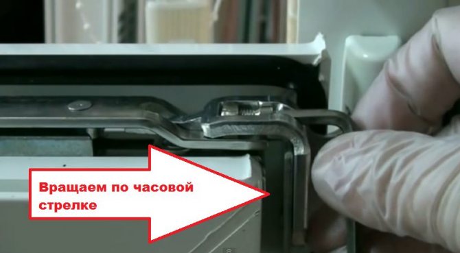 Dans notre cas, il est nécessaire d'augmenter l'écart de la toile avec le cadre, respectivement, dévisser un peu la vis. La quantité de déplacement est perceptible sur la charnière; il y a une trace de sa position précédente et une nouvelle sur la boîte.