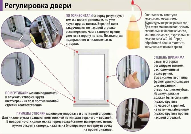 Le diagnostic et la prévention du réglage empêcheront le mauvais fonctionnement des mécanismes internes. Des mesures de lubrification sont nécessaires au moins deux fois par an. Il est préférable d'utiliser deux types de substances à la fois: le silicone et l'agent anti-corrosion. Ce dernier augmentera considérablement la durée de vie des fixations, charnières, cames et élément de cadre. Le libre-service vous fera économiser de l'argent - vous n'avez pas besoin d'appeler un maître chez vous, dont le travail coûtera environ 2000 roubles.