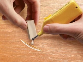 Il existe une option pour se passer de patchs et masquer la surface endommagée avec un mastic spécial, qui comprend des copeaux de bois de la même espèce que le placage. Si vous ne trouvez pas de mastic en vente, vous pouvez trouver des copeaux et le mélanger avec de la colle. La fissure doit être poncée, recouverte de mastic ou de colle avec des copeaux. Après séchage, frottez à nouveau avec du papier de verre et vernissez deux fois avec un ponçage intermédiaire.