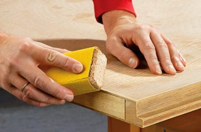 - Les irrégularités sur les bords doivent être lissées avec du papier de verre à grain fin. Pour éviter les traces visibles de traitement, il est nécessaire de recouvrir les bords d'une peinture à dispersion aqueuse à base de polyacrylate. Prenez quelques centimètres des 2 côtés des joints pour que la couche de placage soit absolument uniforme.