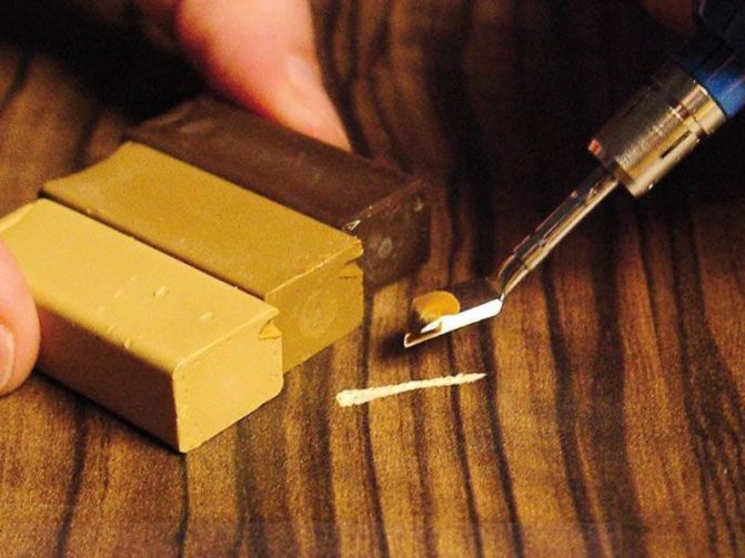 - Si la cire est sélectionnée pour la réparation, elle est chauffée, après quoi des gouttes de cire fondue sont appliquées sur toute la longueur de la rayure ou sur la zone usée. Retirez immédiatement l'excédent avec un chiffon doux.