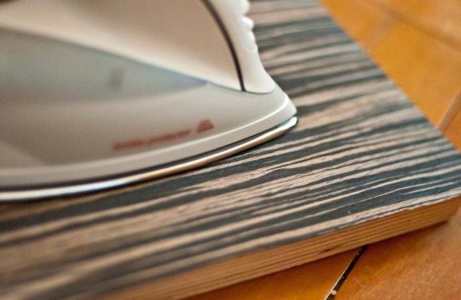 La réparation est effectuée à l'aide d'un fer bien chauffé. Le fer est chauffé en mode moyen et appliqué sur la surface de la toile pendant un certain temps. De plus, le placage devient élastique si vous utilisez un chiffon humide qui s'étale sur la toile et laisse pendant 15 minutes.