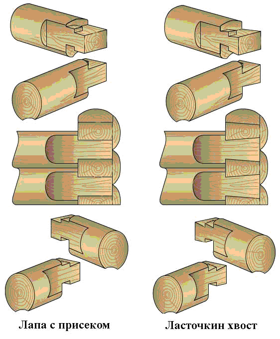Les poutres sont posées en quinconce - comme des briques, de sorte que la queue d'aronde est coupée avec une hache au niveau des barres à travers une rangée pour une meilleure adhérence. Il ne faut pas oublier que le bois doit être de la même section que le matériau de la maison. Ou vous devrez l'ajuster le long du bord extérieur et poser de nombreuses couches de matériau supplémentaire à l'intérieur pour que les murs soient uniformes, sans bosses.