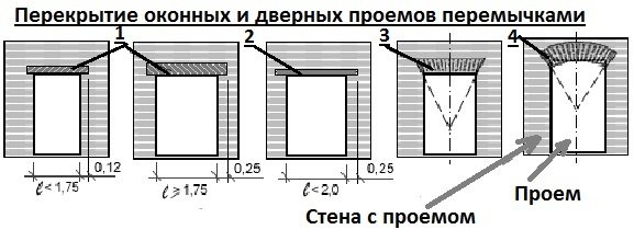 Linteaux: 1. Béton armé 2. D'un profil ou d'un coin en acier. 3. Brique de coin. 4. Brique cintrée.
