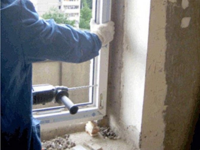Si lors de l'installation des fenêtres en PVC aucune distorsion ne s'est produite, procédez à la fixation avec des ancrages.À ces fins, un perforateur est utilisé. Fixez les ancrages inférieurs, vérifiez le système et fixez les points restants.