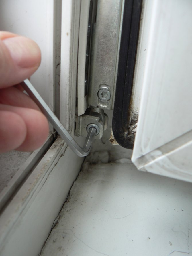L'attention des utilisateurs est souvent attirée par l'affaissement des portes en PVC sur les charnières. Le problème est simple et assez facilement démontable. Dans un premier temps, la régulation de la position de la nappe est effectuée. Il est plus facile de le faire avec une clé Allen à portée de main. L'outil s'insère dans la rainure située sur la charnière inférieure et tourne dans le sens des aiguilles d'une montre. D'un simple mouvement, la position de la porte est rétablie : la toile monte à la hauteur spécifiée.