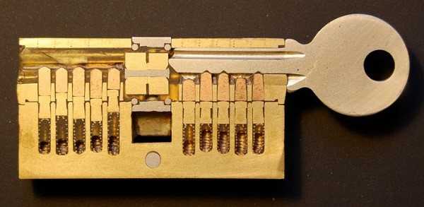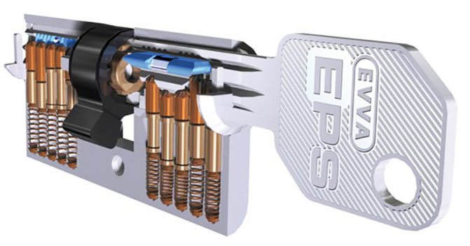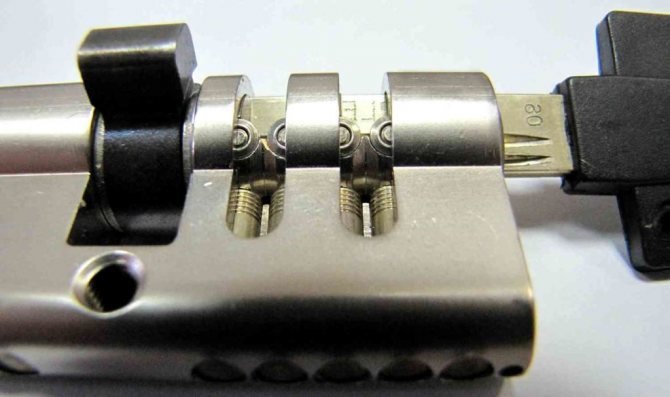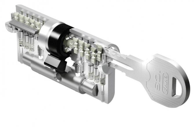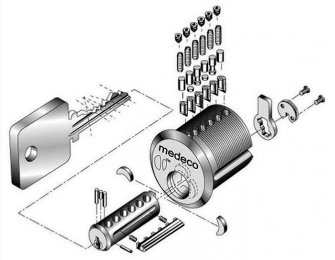 À l'intérieur du cylindre, les soi-disant goupilles sont situées sur des ressorts constitués de deux moitiés. Si le centre de la goupille ne tombe pas sur la circonférence du cylindre, alors la rotation de ce dernier sera bloquée. Plus la serrure est complexe, plus on y utilise de goupilles qui doivent être positionnées simultanément à la hauteur souhaitée.