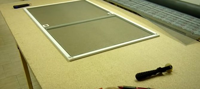 - puis coupez l'excédent de maillage à l'aide d'un couteau d'assemblage tranchant. Pour ce faire, le treillis est plié vers la partie principale du panneau (à l'intérieur du cadre) et la lame est maintenue le plus près possible du cordon d'étanchéité afin que le couteau passe toujours sur le plastique sans toucher le cordon. C'est plus facile de partir du coin;