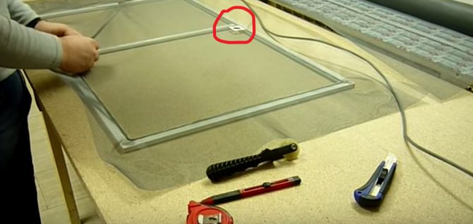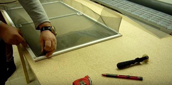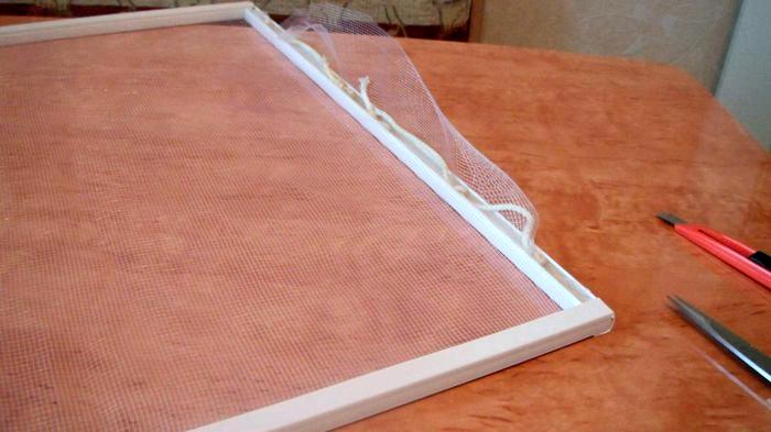 Si le cadre est fait d'un profil spécial, un cordon est placé sur la rainure le long de la toile et enroulé avec un rouleau jusqu'à ce qu'il soit complètement enfoncé dans la rainure. L'excès de maille est coupé, laissant environ 1 cm (au-dessus de la rainure).