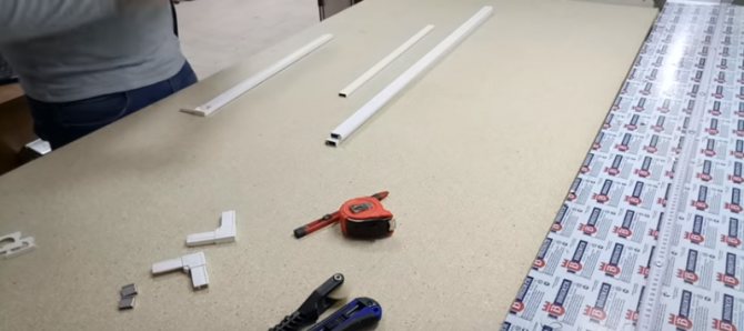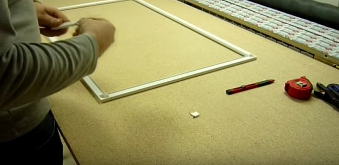 - des fragments du profil sont reliés par des coins, la taille de tous les coins est vérifiée (strictement à 90 degrés). Pour la fixation au profil de la traverse, des pièces de connexion spéciales sont utilisées - elles sont insérées dans les cavités de la traverse coupée et fixées au cadre;
