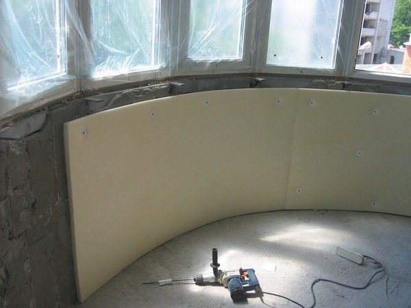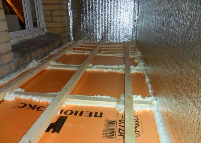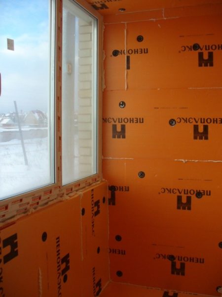 Pour faire un balcon chaud, une feuille de mousse de 50 mm d'épaisseur est utilisée pour les murs et le plafond, dont la résistance au transfert thermique est de 1 m2 · ° C / W. Les feuilles sont fixées avec de la colle spéciale ou des champignons en plastique, les joints sont traités avec de la mousse de polyuréthane.