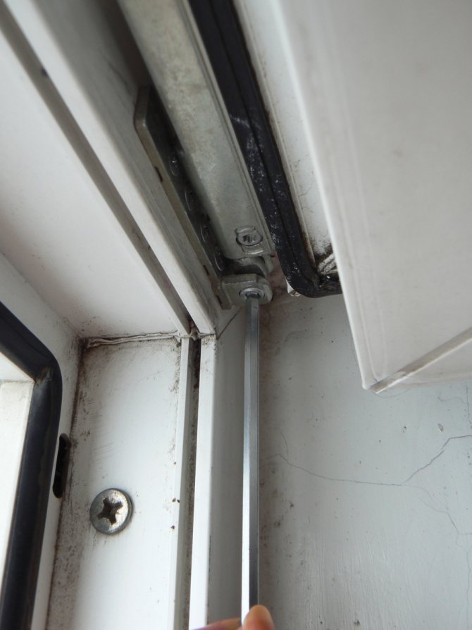 La partie supérieure de l'ouvrant est régulée par un mécanisme situé sur l'ouvrant lui-même - en haut. Pour s'ajuster, l'ouvrant doit également être ouvert, presque large. À l'arrière, presque tout en haut, il y aura une rainure de réglage. Nous y insérons un hexagone et le tournons.