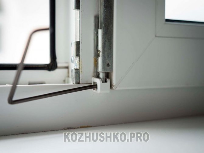 Position de l'ouvrant "haut-bas" peut être changé avec les vis de réglage. Il est nécessaire de retirer le bouchon décoratif du châssis inférieur de la fenêtre en plastique. Il y a un trou sur le dessus du mécanisme de charnière pour une clé Allen de 4 mm.