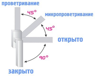 Pour ouvrir la fenêtre pour la ventilation, vous devez d'abord tourner la poignée en mode d'ouverture inclinable, puis (sans ouvrir la fenêtre), la tourner sur le côté de 45 degrés supplémentaires, puis tirer la poignée jusqu'à ce que la partie supérieure s'ouvre.