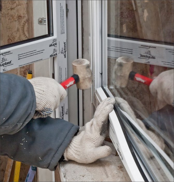 Les perles de vitrage sont enfoncées dans la serrure avec un maillet avec de légers coups. Vous pouvez également utiliser un marteau ordinaire à travers un bloc de bois, à condition de ne pas endommager la pièce en plastique.