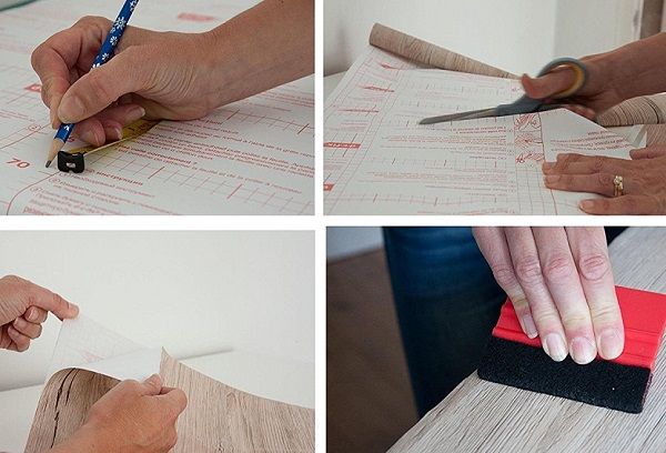 - Si vous décidez de fixer un film autocollant sur des éléments tels qu'une table, des chaises, une armoire, une commode, une collection de couleurs de revêtement modernes et d'illustrations vous permettra non seulement de rafraîchir l'intérieur de votre maison, mais aussi de changer complètement le style.